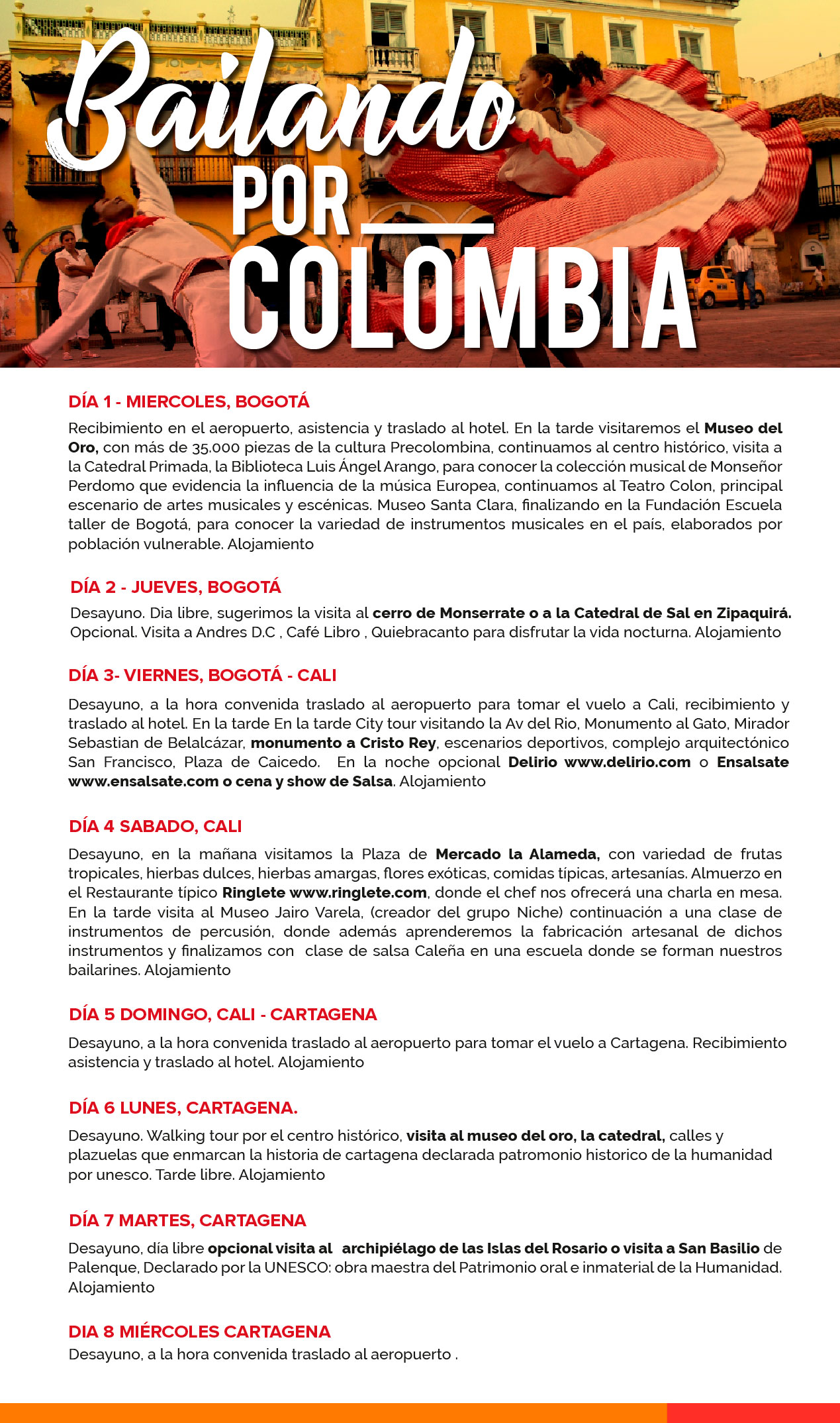 Vive un Circuito por Colombia, disfruta del baile y recorre los principales atractivos de Bogotá, Cali y Cartagena durante 8 días.